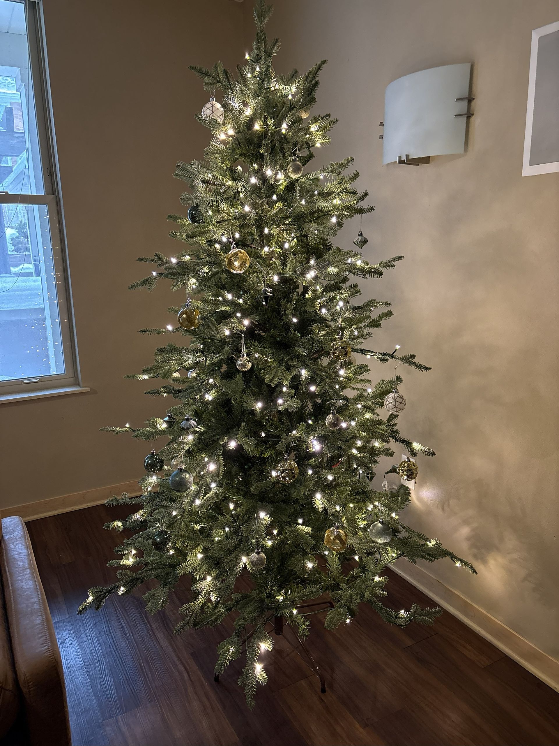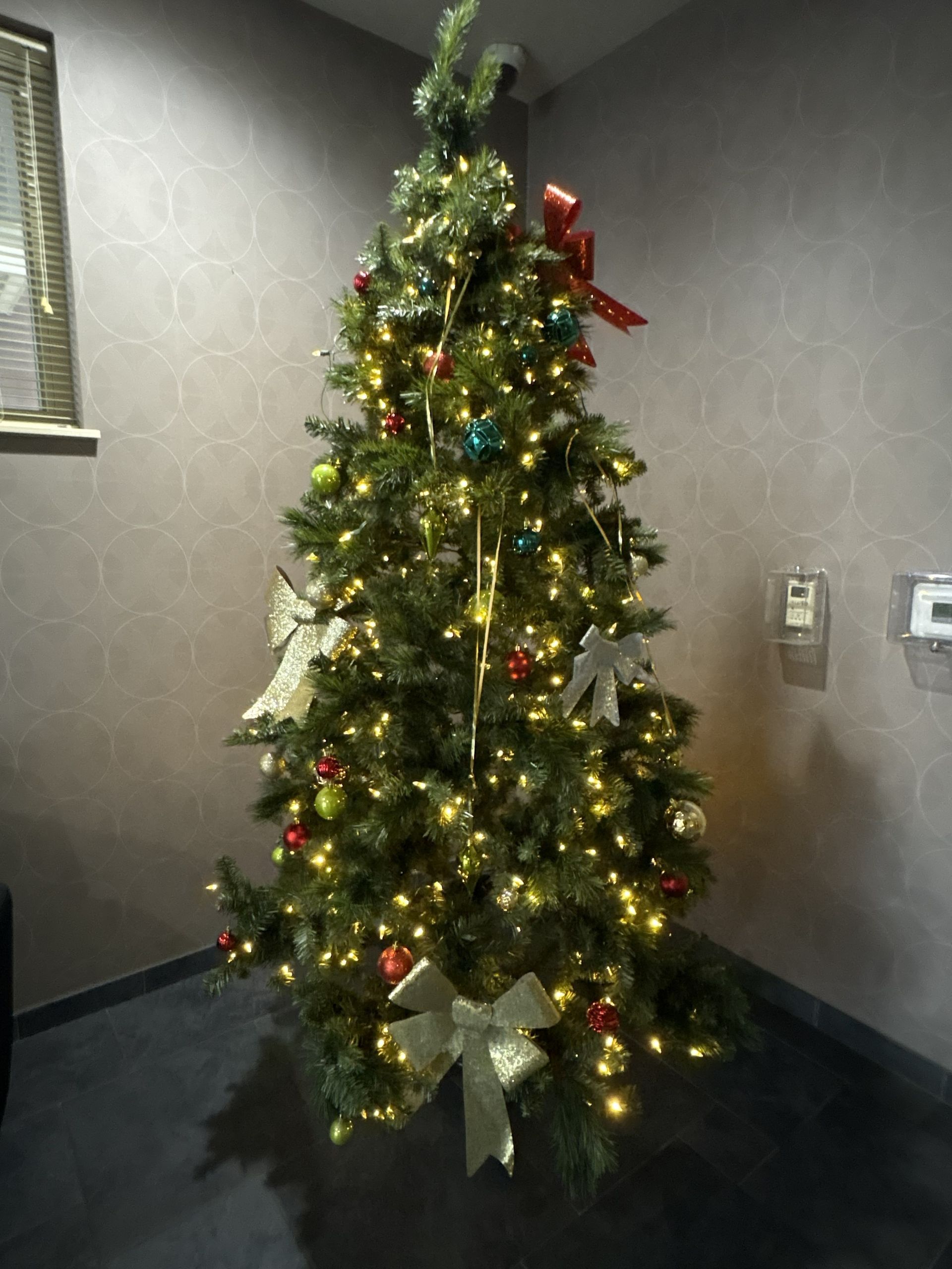Inside, a tall tree stands bright with warm lights and traditional red, gold, and green ornaments. It’s understated but elegant. You’ll also find festive ribbons and just the right amount of holiday shimmer.